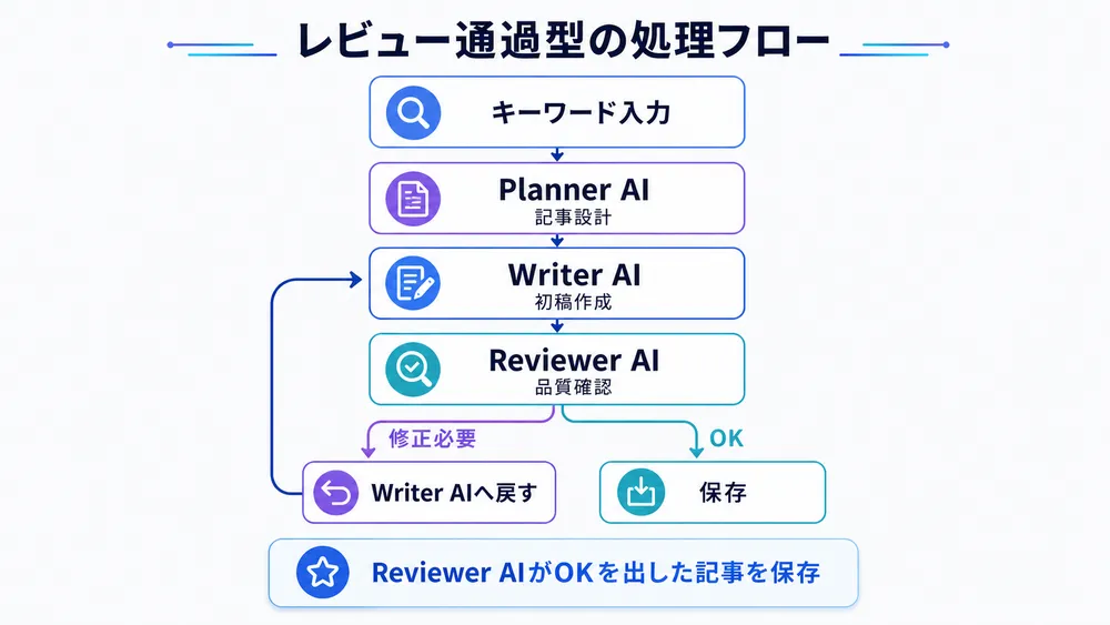 Reviewer AIが再確認このように、Writer AIが作成した記事をReviewer AIが確認し、OKなら保存、修正が必要ならWriter AIへ戻す 流れにします。
