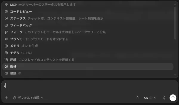 GPT-5.5のような高性能モデルを使い、コード作成、バグ修正、テスト、Git操作などを自然言語で依頼できます。