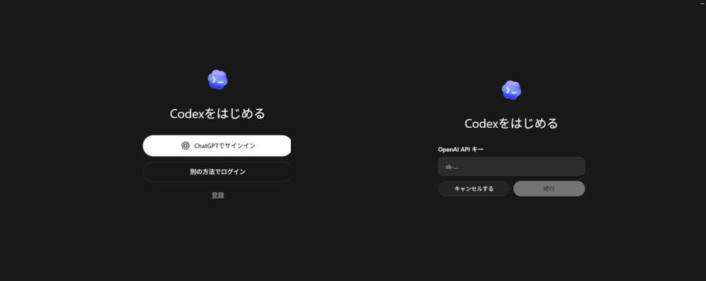 Codexアプリは、ChatGPTアカウントとOpenAI APIキーの2つの方法でサインインできます。