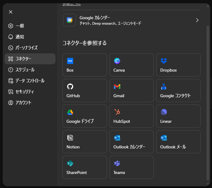 GPT-5世代からは「コネクタ(Connectors)」が導入されました。