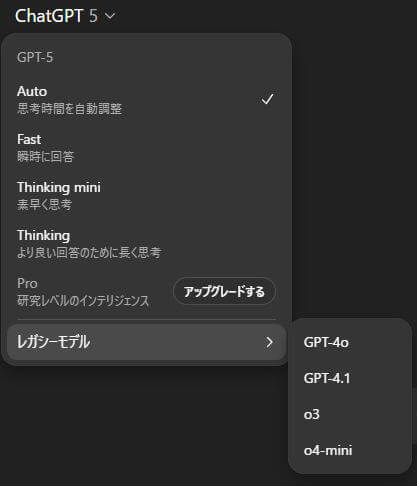 • Plus/Proユーザー:GPT-5に加え、一部の旧モデル(GPT-4o等)が選択可能
