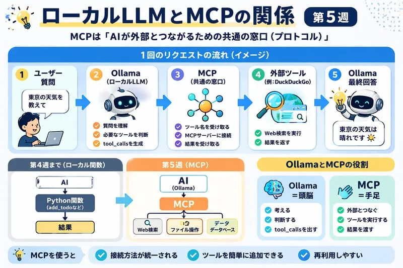 第5週では、AIアプリと外部システムを標準的につなぐ仕組みであるMCP(Model Context Protocol)の基本と、ローカルLLM環境での扱い方を学びます。