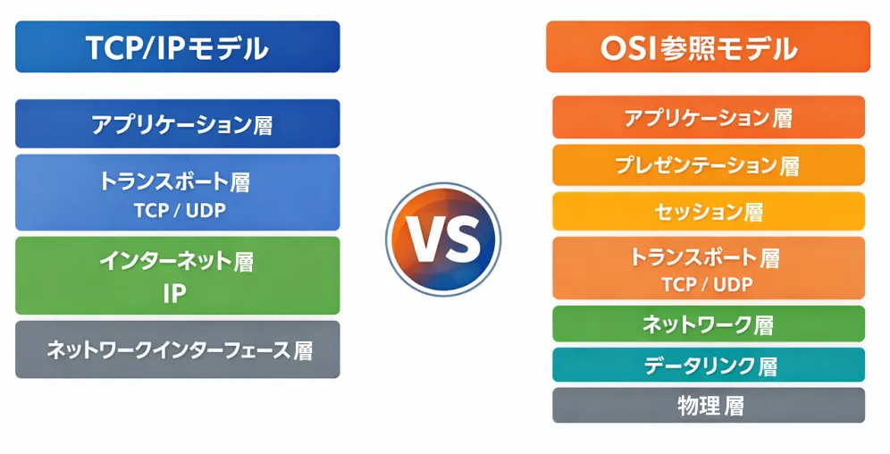OSIは設計・学習用、TCP/IPは実運用という役割の違いがあります。