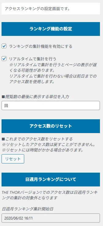「キャッシュを消してもダメだ」と思ったら、時間を置くのを待つか、一度ランキング設定のON/OFF切り替えや、アクセス数のリセットを試してみることをお勧めします。
